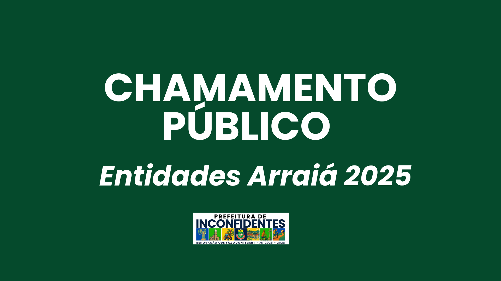 A Prefeitura Municipal de Inconfidentes, por meio do Departamento de Indústria, Comércio, Turismo e Cultura, abre cadastramento para Organizações da Sociedade Civil (OSC), Organizações Sociais (OS), Entidades Beneficentes Sem Fins Lucrativos e Entidades Escolares Públicas do Município que querem participar do evento Arraiá Beneficente de Inconfidentes 2025.